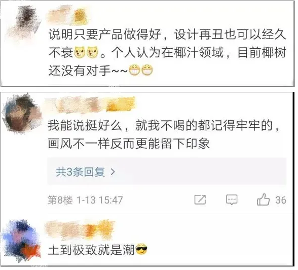 期间,椰树也曾尝试更换新包装,但网友表示却是“换汤不换药,换壳不换心”,将土味一直延续下去,形成一股稳稳的“土潮风”。